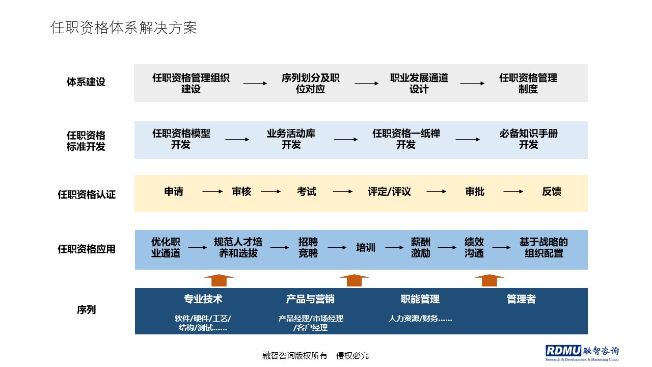 咨詢業(yè)務 構建以產品為核心,基于增量產出的管理體系 首頁 咨詢業(yè)務 解決方案詳情 系統(tǒng)解決方案:融智三六三模型 IPD產品管理整體解決方案 研發(fā)體系解決方案 營銷體系解決方案 增量績效體系解決方案 任職資格體系解決方案 軍工產品化整體解決方案 創(chuàng)新型企業(yè)戰(zhàn)略合作伙伴 幫助客戶提升核心競爭力 400-910-9910 在線溝通 一、任職資格體系解決方案 二、模塊劃分 1. 序列劃分及職業(yè)通道 2. 任職資格標準開發(fā) 3. 任職資格認證及應用 三、解決問題 1. 完善職位序列,建立職業(yè)通道; 2. 規(guī)范人才培養(yǎng),建立培訓體系; 3. 讓員工照鏡子,找差距,主動學習; 4. 通過任職資格的經歷要求,鼓勵崗位輪換; 5. 通過任職資格的業(yè)績要求,規(guī)范晉升和薪酬的調整機制; 6. 通過人員的分層分類,調整人員結構。 任職資格體系解決方案